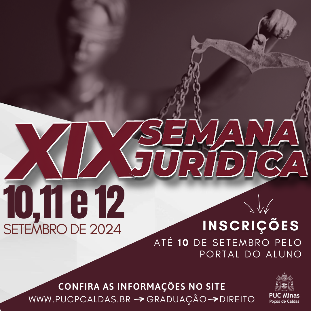 Prezados Alunos, é com satisfação que apresentamos a nossa XIX Semana Jurídica, organizada pelo nosso curso de Direito, da Pontifícia Universidade Católica de Minas Gerais, campus de Poços de Caldas, e que será realizada nos dias 10, 11 e 12 de setembro de 2024. Neste segundo semestre de 2024, as palestras serão realizadas presencialmente no prédio 2 da Puc Minas campus Poços de Caldas.