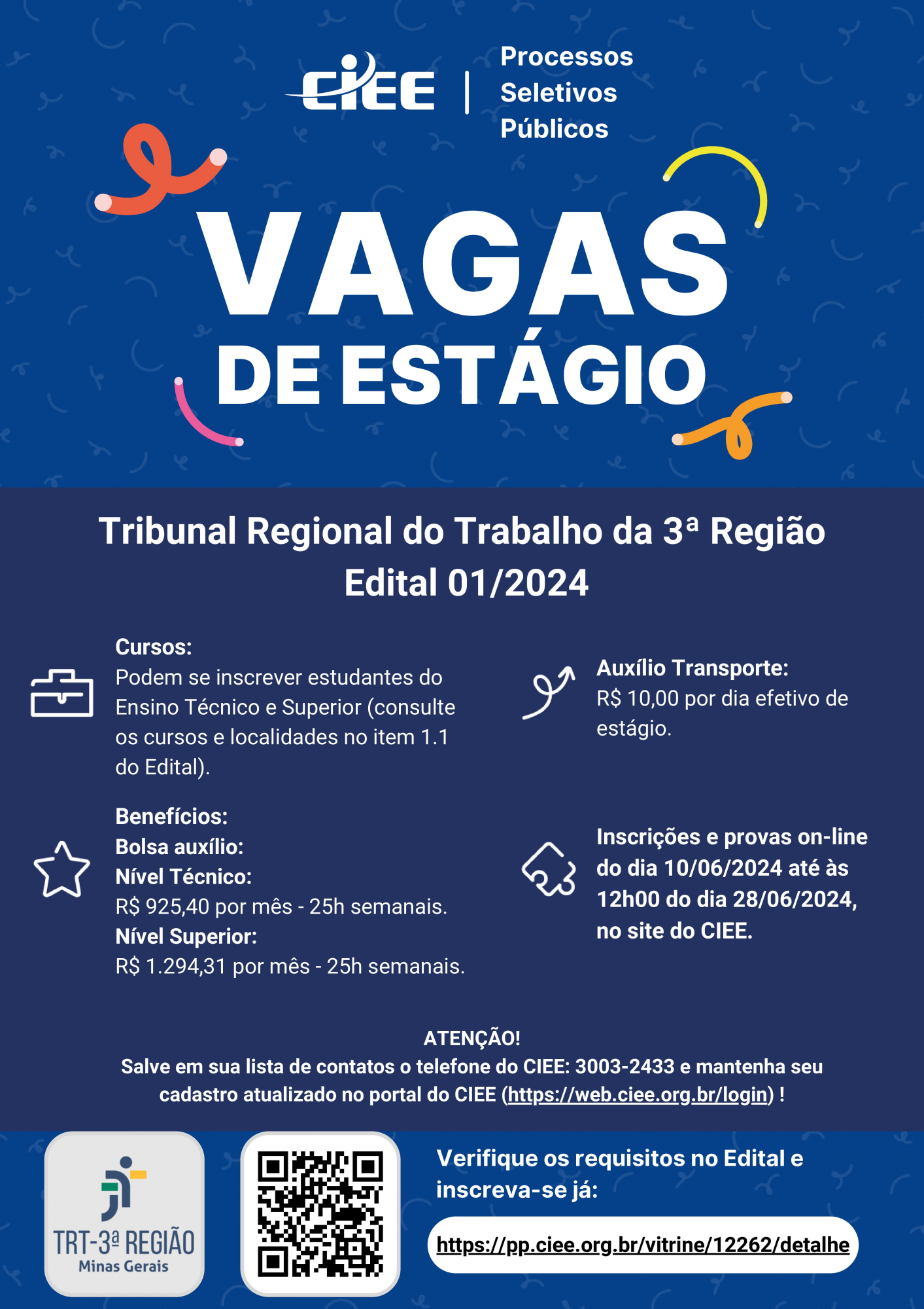 OPORTUNIDADE DE ESTÁGIO - TRIBUNAL REGIONAL DO TRABALHO DA 3º REGIÃO EDITAL 01/2024